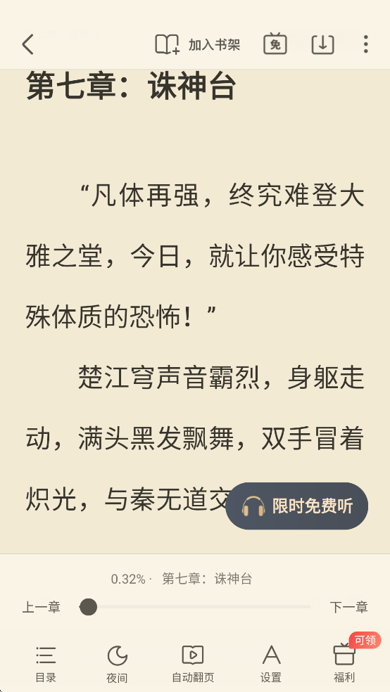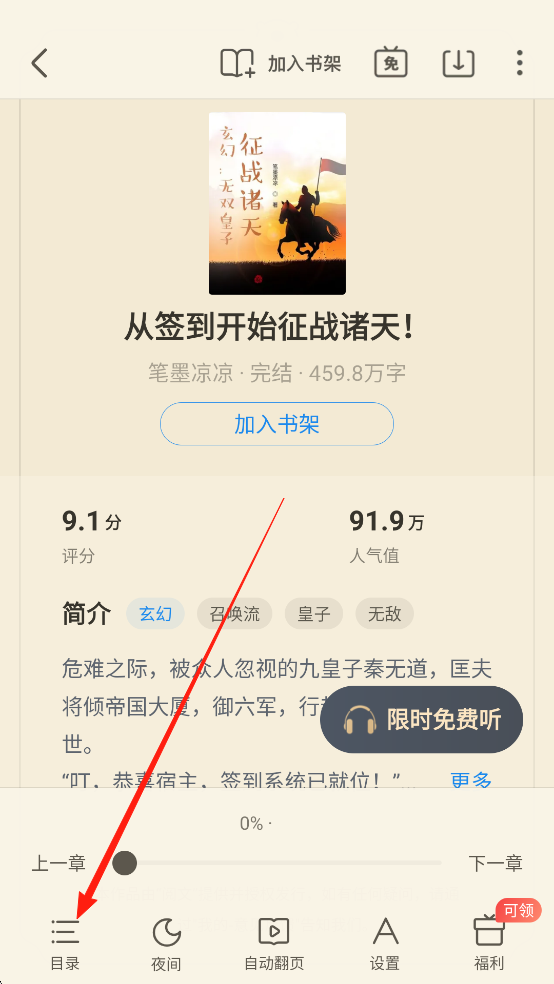 3、跳转到相应章节之后,如果发现不是想要阅读的章节,点击页面中间位置,呼起功能菜单,重新点击目录挑选