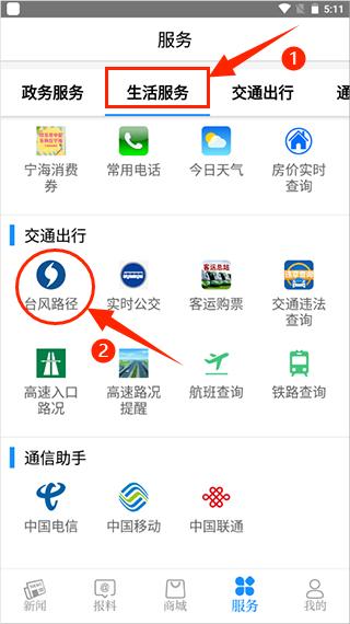 2、在“生活服务”的版块中找到交通出行选项点击“台风路径”。
