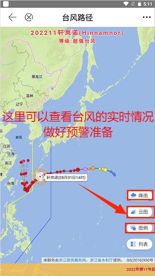 3、即可了解台风气象的消息,想了解具体情况可以分别点击降雨、云图、图例和列表来了解。