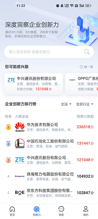 2、点击创新力,你可以在这里查看到国内各大企业的企业创新力指数以及各种信息;