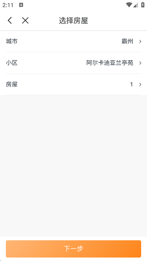 2、首先需要先绑定您的房屋(已绑定可跳过),城市小区房屋,点击下一步