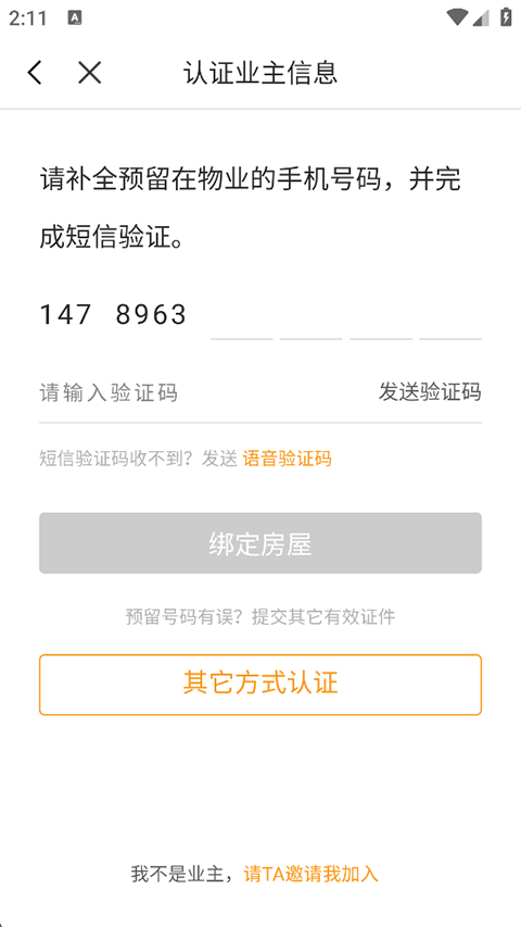 3、输入预留在物业的手机号并填入验证码以完成绑定;