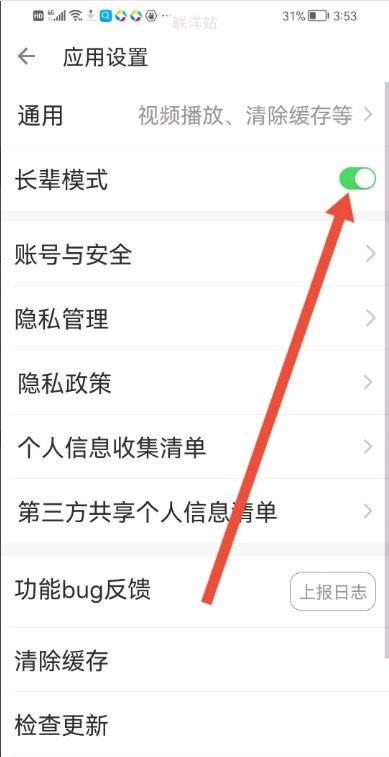 4、进入应用设置,接下来把【长辈模式】的按钮开启即可