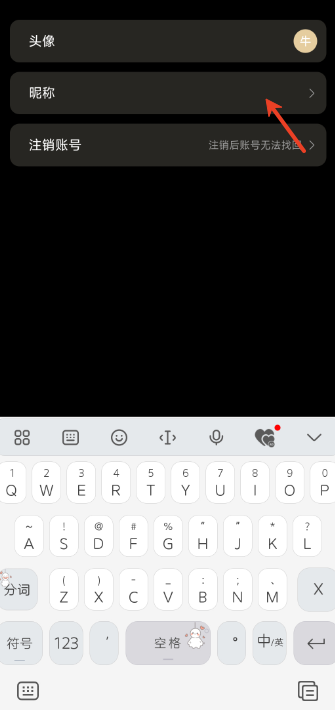 第三步:在个人信息页面点击昵称栏目,即可展开键盘栏;