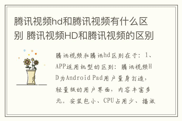 1、APP适用机型的区别:腾讯视频HD为Android Pad用户量身打造,轻量级的用户界面,内容丰富多元。安装包小、CPU占用少、播放更加流畅清晰。大片、剧集、综艺,动漫,最新最热的视频资源,高清观看。支持播放记录的功能,方便进行视频续播和回放。