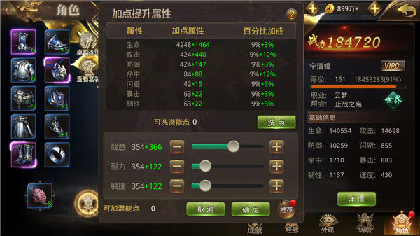 角色每提升1级,就能获得10潜能点,可以自由分配在战意、耐力和敏捷上。其中战意加点影响角色的攻击和命中,耐力加点影响角色的生命、闪避和韧性,敏捷加点影响角色的防御和暴击。三大属性分别影响角色不同维度的成长,想培养什么样的角色,就看各位的自由发挥了。