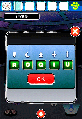 这个屏幕和玄关上的图案对应,i~u,方形~d,十字|架~i,i~u,叠三角~q,五角星~d,盾r,月亮~o,菱形m,铜钱~n