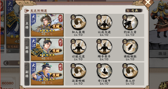 刘邦为队伍增加增伤和护航辅助效果,韩信有稳定的输出技能,张良提供增伤效果,整体输出能力强大。
