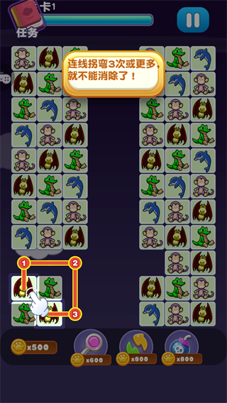 3、消除的方法很简单,只需将相同的图案连接起来就可以了,注意连线拐弯3次或更多就不能消除了!