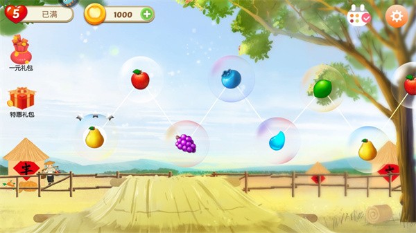 果缤纷乐园手游是一款画面简洁清新,不含有花哨繁琐的游戏元素,为玩家带来极致的清爽游戏体验的休闲游戏应用。以富有乡村风情的果园和农夫作为背景主题,游戏的关卡元素以水果为主要素材,为玩家打造了独特而有趣的游戏世界。每一个关卡都以不同种类的水果展开,充分考验了玩家的策略和操作技巧。游戏画面以明亮的色彩和简单的设计为特征,让玩家可以轻松愉悦地享受游戏乐趣。整个游戏场景自然舒适,丰富的音效和精美的界面设计也让玩家在游戏过程中倍感舒心。休闲时间的小憩还是想逃离都市喧嚣的时刻,都可以选择打开果缤纷乐园,享受其中的愉悦体验。