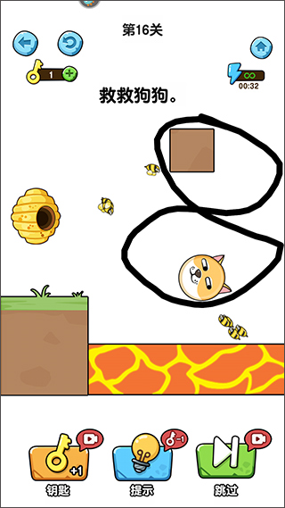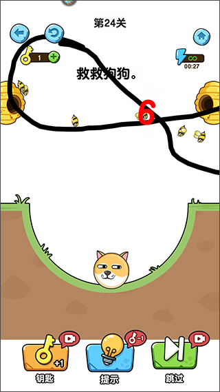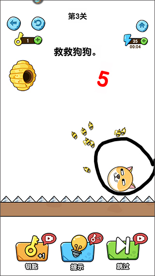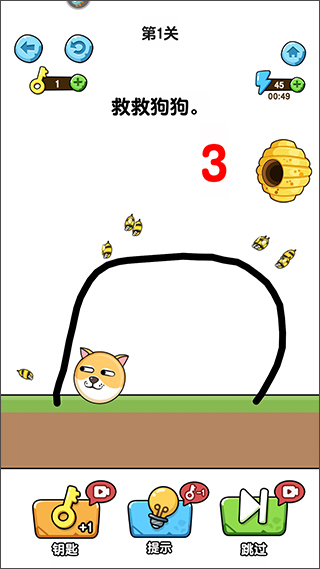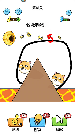 游戏拥有着非常精致的画面,每一个关卡都经过了精心设计,带来了各种烧脑解谜元素,游戏的主要玩法是利用画线的方式来保护狗狗不被蜜蜂攻击到,大家需要打破常识才能完成通关,并且该版本经过了修改,无需观看广告即可获得体力的奖励