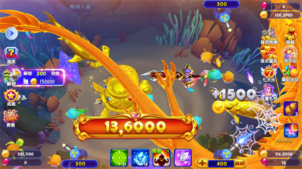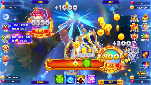 1、使用方法:点击召唤可以在游戏中召唤一条强力的奖金鱼,每当我们击杀奖金鱼后,会在奖金池内积揽一笔金额,击杀的奖金鱼越多,奖池的金额也就越多,等级也就越高,我们可以享受到不用等级的抽奖活动,有可能抽中红包或者钻石、金币等奖品。