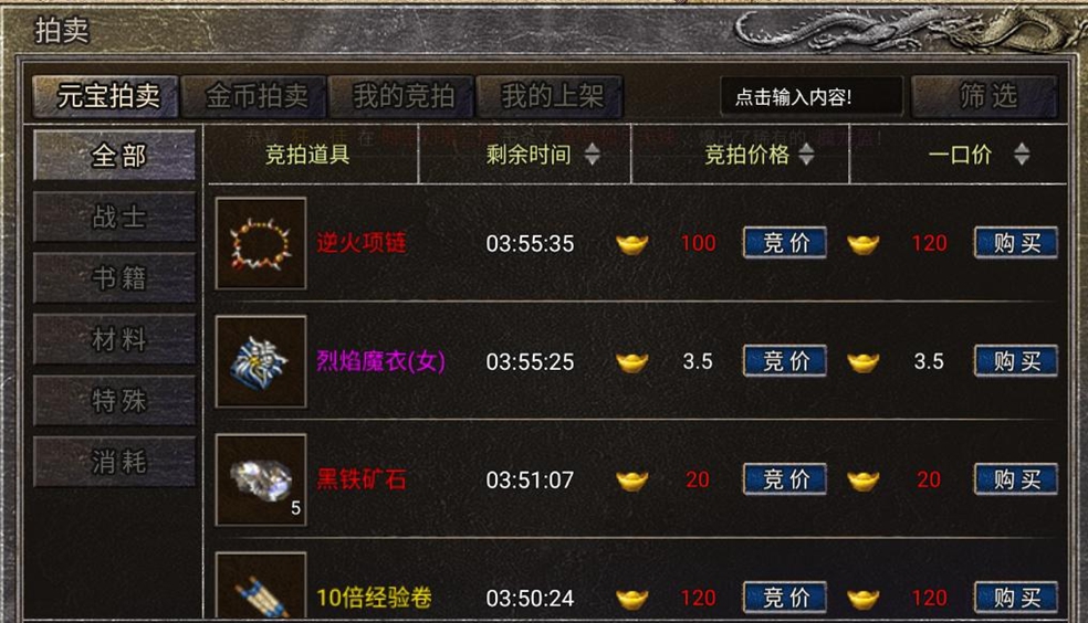 拍卖行是游戏中的强大交易功能,只要有商品上架,是装备,技能书,材料或是消耗品均可随时购买到。