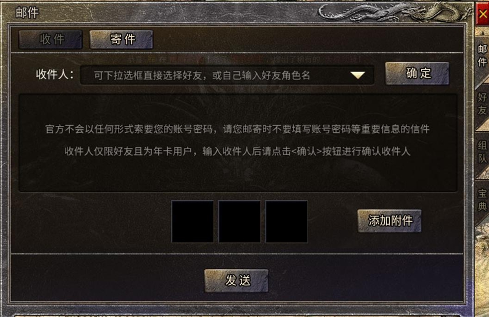 选择接收道具的好友或者直接输入角色名,并添加寄出的道具附件即可完成寄件。