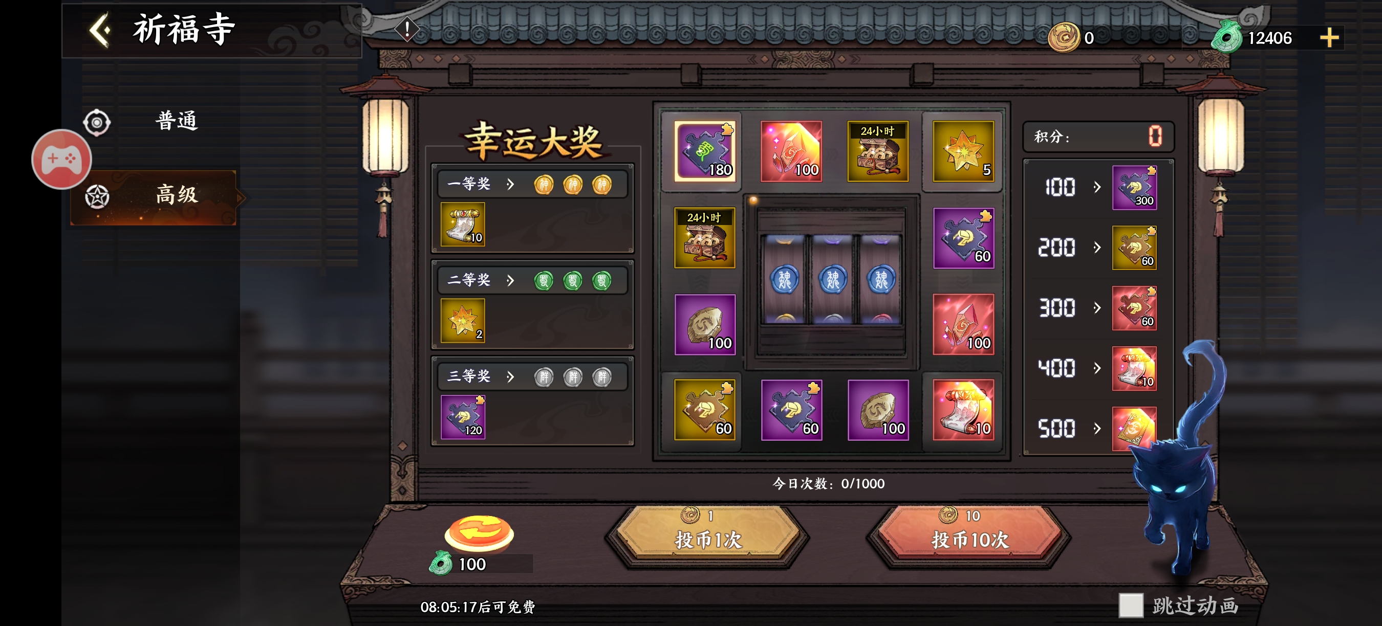 转盘中包含4个大奖和8个小奖,大奖只能获得1次,小奖可重复获得,每次投币有概率额外赠送一份幸运奖励,大奖出现可以选择刷新一下奖励,每档幸运奖励只能获得一次 。