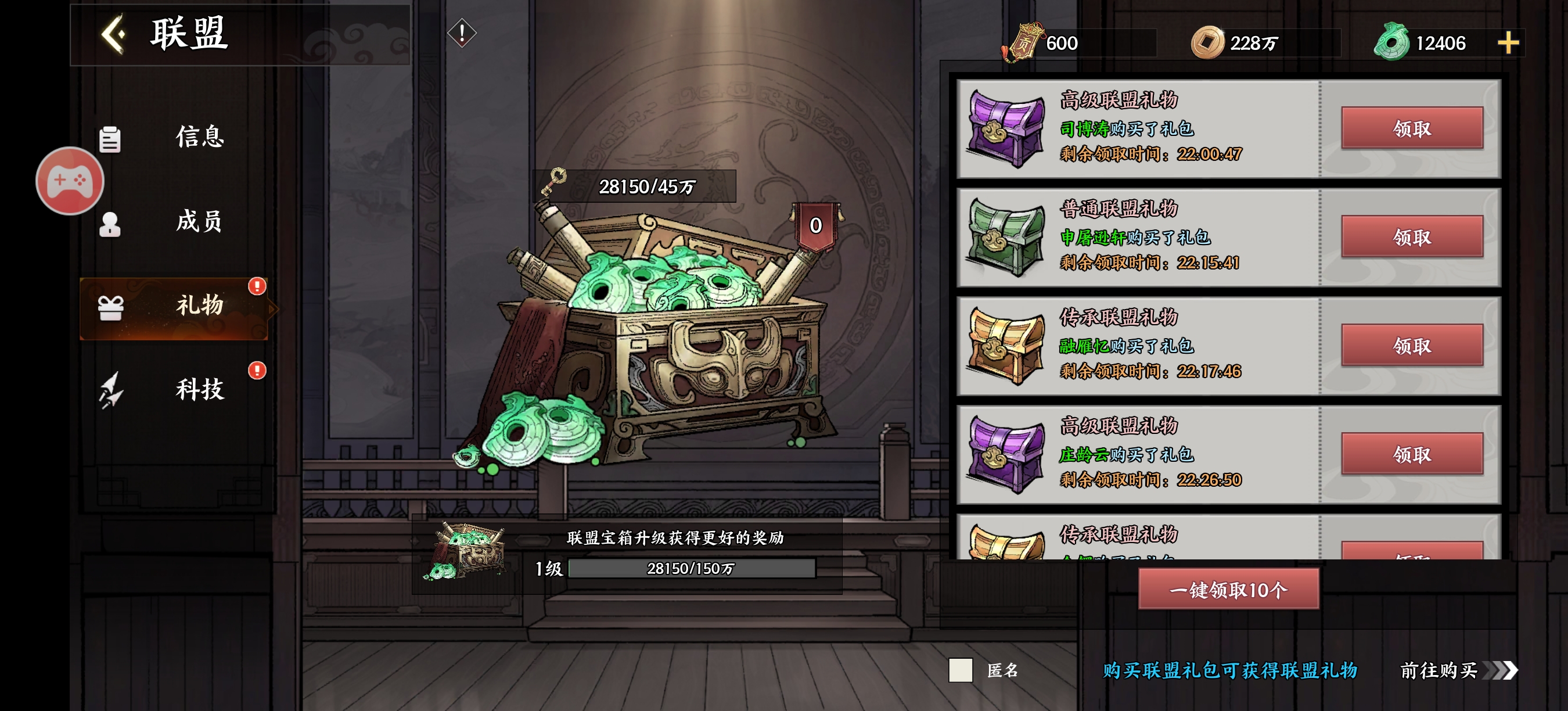 进到一个好的联盟可以白嫖到材料箱子,也可以跟兄弟们一起玩,组队试炼出现的时候就可以一起打打了,组队能获得的奖励非常丰富。