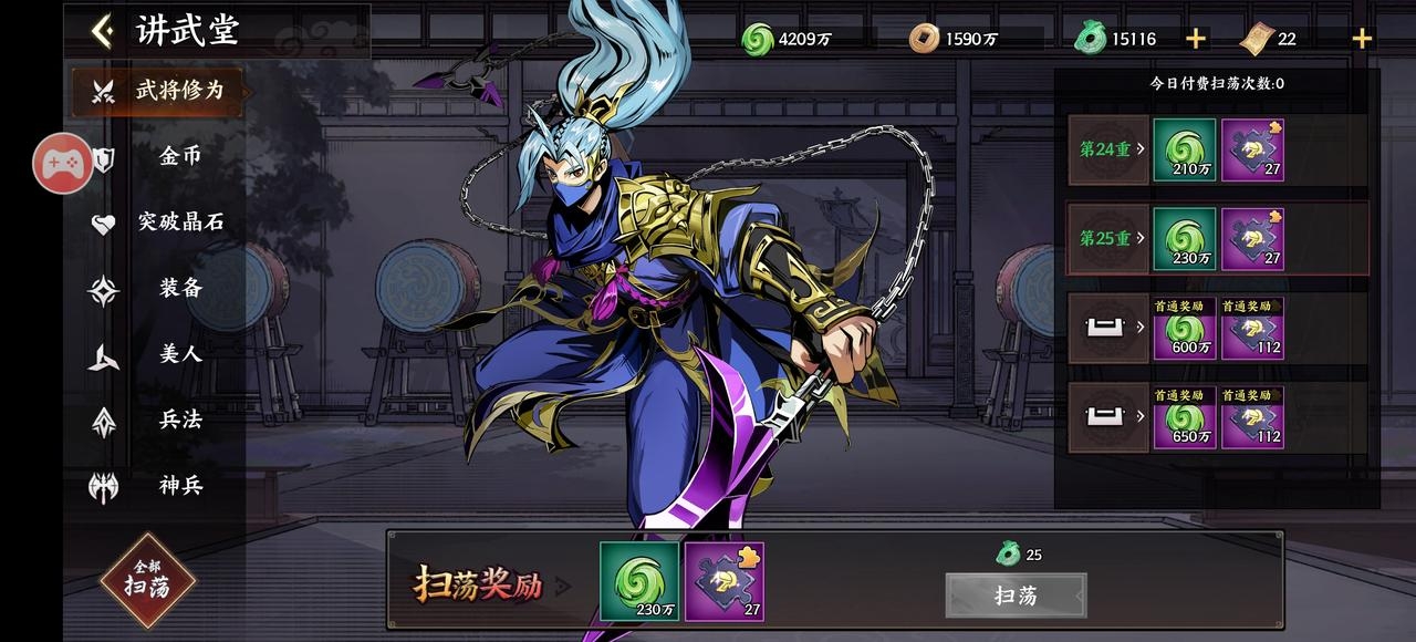 讲武堂包括武将修为、金币、突破晶石、装备、兵法等养成物品。每日可挑战更高层数,打不过就扫荡原层数,一定打到最高层数后再进行扫荡,将收益最大化,还可以使用仙玉购买次数,建议都尽量买满次数 。