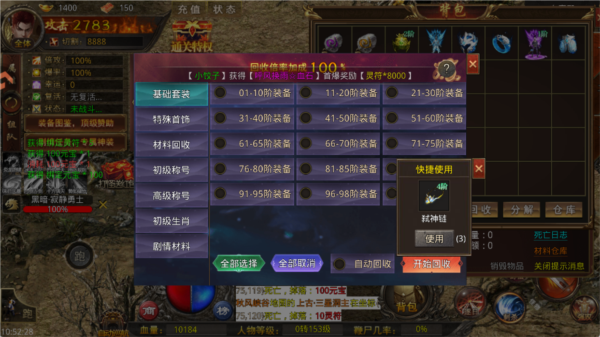 4、多余或低阶装备支持一键回收,快速清包还能获取资源;
