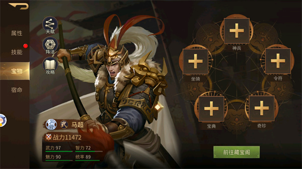 武将还可以装备宝物,宝物可通过藏宝阁打造,或者是充值获得。