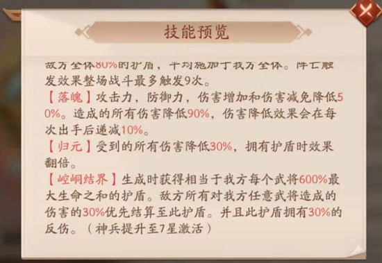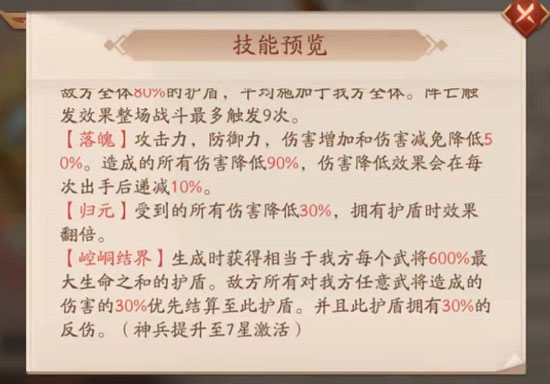 【崆峒结界】生成是获得相当于我方每个武将600%最大生命值之和的护盾。敌方所有对我方任意武将造成的伤害的30%优先结算至此护盾。并且此护盾拥有30%的反伤。