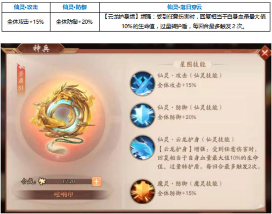 【云龙护身】会在战斗开始时为持有者增加100点杀意和4点怒气,保障持有者具备爆发基础可以稳定地输出。与太极羽衣及李广弓相比,崆峒印的出现,已经由曾经单一的为持有者增加兵甲,变为我方全体友军都可以获得300点兵甲,每点兵甲,依然是提供0.2%的兵甲减伤,这里再次强调下,兵甲减伤不等同于普通的减伤,它可减免所有类型的伤害,灼烧中毒、反伤、元素伤害等都囊括其中。每次兵甲的破碎(受到神兵伤害时有20%的概率破碎30点),都会为我方全体施加50%的伤害增加和伤害减免。希望大家不要忽视,崆峒印并不只是把兵甲从单一拥有做到普及化,【龙魂】的存在,还会让持有者自身兵甲的减伤效果提高100%,减伤上限最高可达80%!