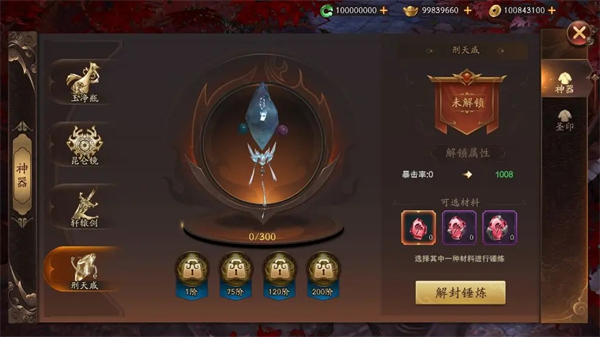 神器共有4个,分别提供不同的基础属性(生命、防御、攻击、暴击),每个神器带有4个技能,当神器升级到一定阶层时,即可激活技能。技能升级可以强化技能。