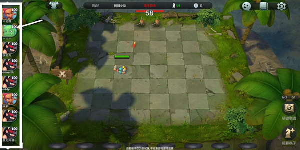 (1)左侧首列是本局对战的玩家,玩家右上角的100数值代表本局角色的血量值,血量值为0时为失败淘汰出局。