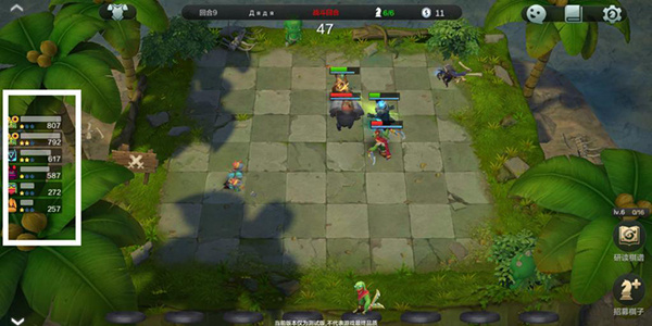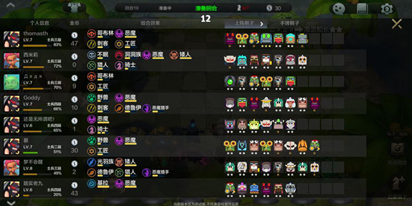 (3)左侧种族和职业列表继续下滑,是当前实时的战斗数据,包括阵上旗子的星级、血量信息。这个若是要升星哪个,可以来这里看下是几星了,要不要升了。