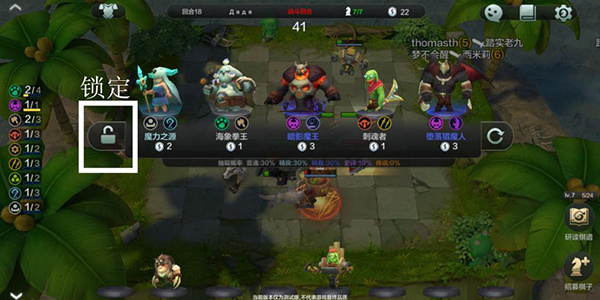 (1)右侧下方是招募棋子栏和研读棋谱。战斗与否,都可以招募棋子,每局结束后会有一次免费的刷新招募,也可以自己花2金币刷新。刷出自己想要棋子没有金币时,可点击左侧的锁,这样下次就不会自动刷新了。关闭招募只需点击其他空白地方。