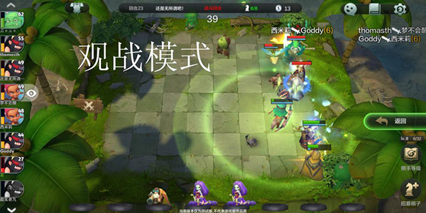 (6)点击左侧任意玩家头像框时,可弹出观战页面,此时进入此玩家的战斗战斗页面。点击右侧的返回键可以返回自己页面。