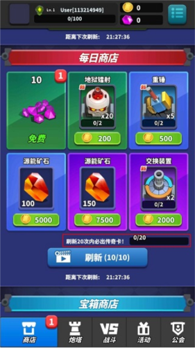 在每日商店中,可以每日看广告刷新最多10次商店,有机会在6号位置随机刷出传说炮塔或者传说英雄,刷新二十次必出传奇卡,只需要一千钻石哦。