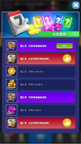 这个大家应该都有注意到,新手玩家注册完登入后会弹出一个新手的【七日签到】福利活动,玩家分别可以在第二天和第七天必得传说炮塔。
