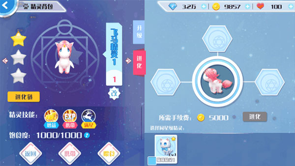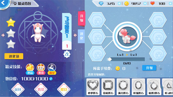进化:在上述精灵养成界面选择进化页签,即可让精灵进化升星。每升一星精灵的外貌都会发生变化哦!一星精灵升2星需要10级,还需要三只一星精灵作为素材;二星精灵升3星需要20级以上,还需要另三只二星精灵作为素材。