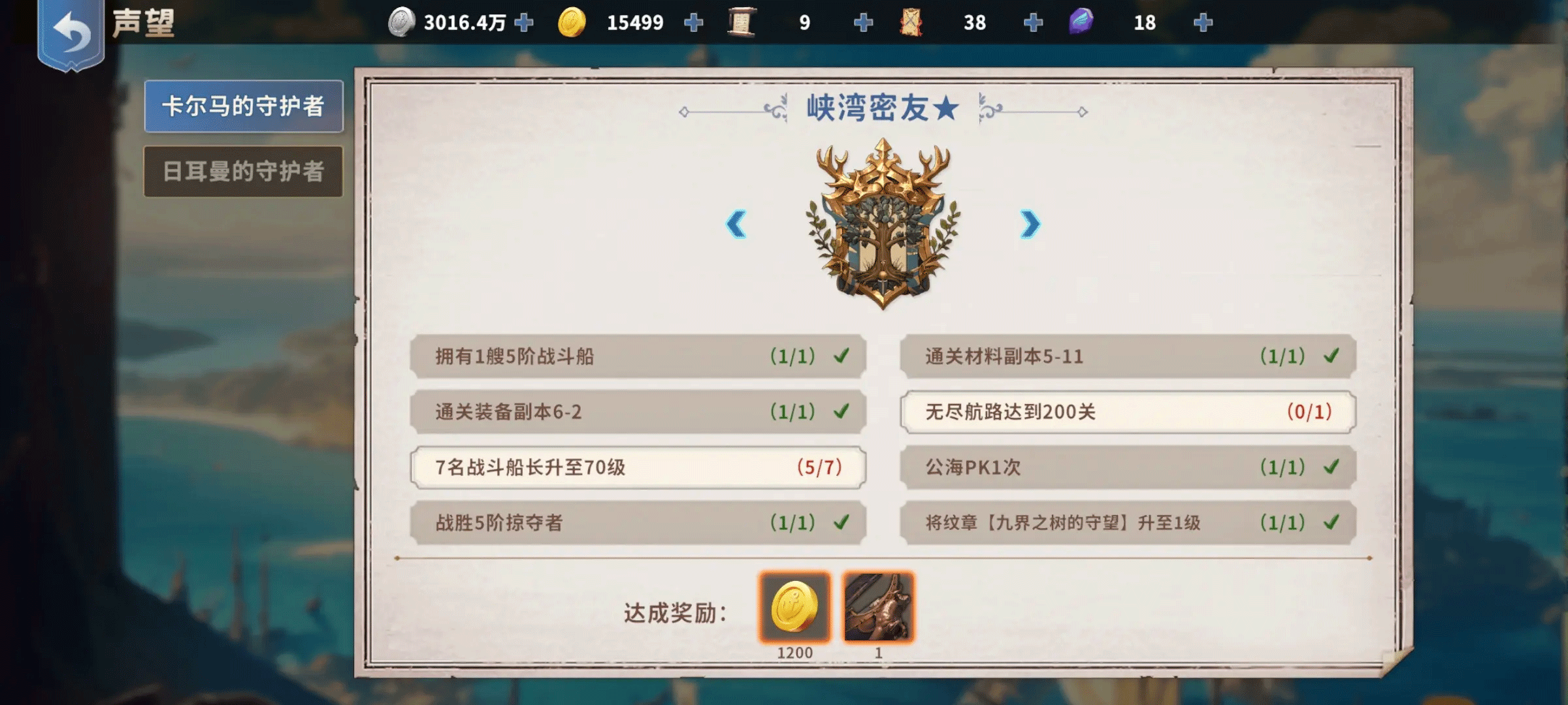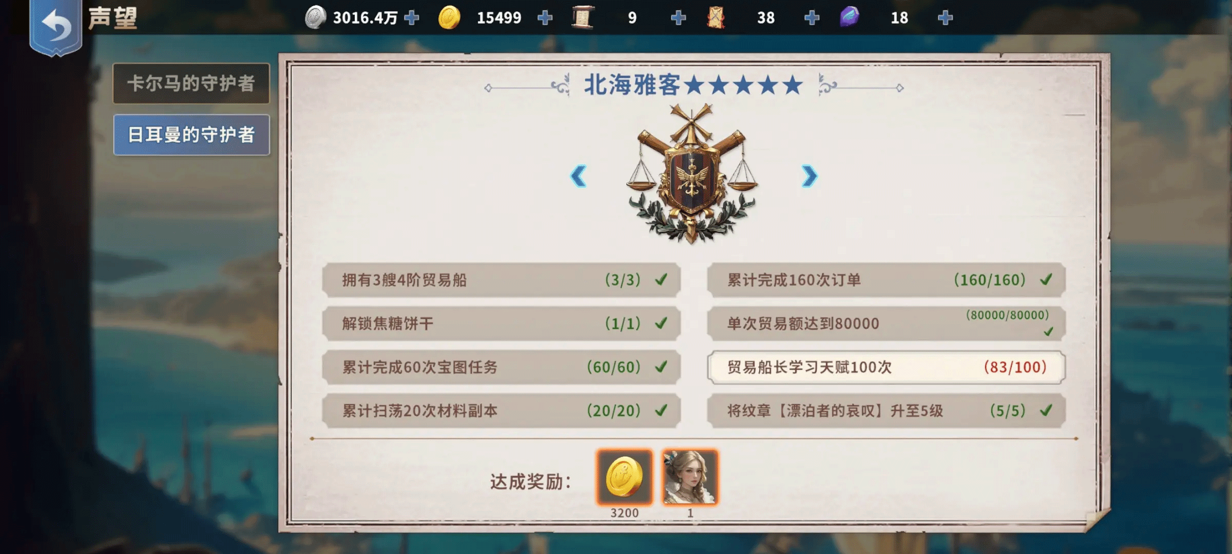 3、单线贸易问题:橙色之前跑双边,两边都开了第一个橙色货物后相信你的船和贸易船长也有了一定的强度,这时可以选择马卡尔和日耳曼其中一条线单边贸易,这样可以最快速度开到金货材料,每天30刷不出来我还能掉头去跑一边的橙货何乐而不为。马卡尔声望任务是雷利和一套商城648那种金装,日耳曼贸易单价稍高,声望奖励载重藏品和卢克,后续奖励可以用过声望任务左右箭头查看,可以根据自身进度和喜好选择。