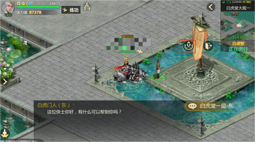 进入白虎堂后可点击下图红框按钮寻路至门人处,对话后进去白虎堂一层。