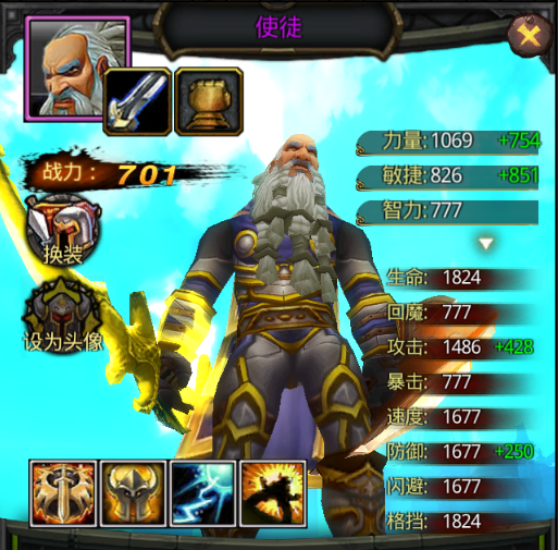 使徒是力量英雄,所以攻击值由力量点数决定,攻击:1486(力量点数提供的)+428(武器提供)
