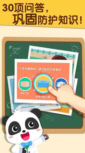 宝宝预防肺炎这款游戏专门为儿童量身打造,采用情景模拟搭配益智问答的形式,让孩子在游戏中轻松学习有关于新型冠状病毒肺炎的知识,学会正确预防,采取正确的保护措施,养成良好的讲卫生习惯