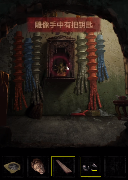 ①此处雕像用木板和石子拿到,从而获取“钥匙”。木偶头放在牌位上,用画笔画眼睛,获得房顶饰品