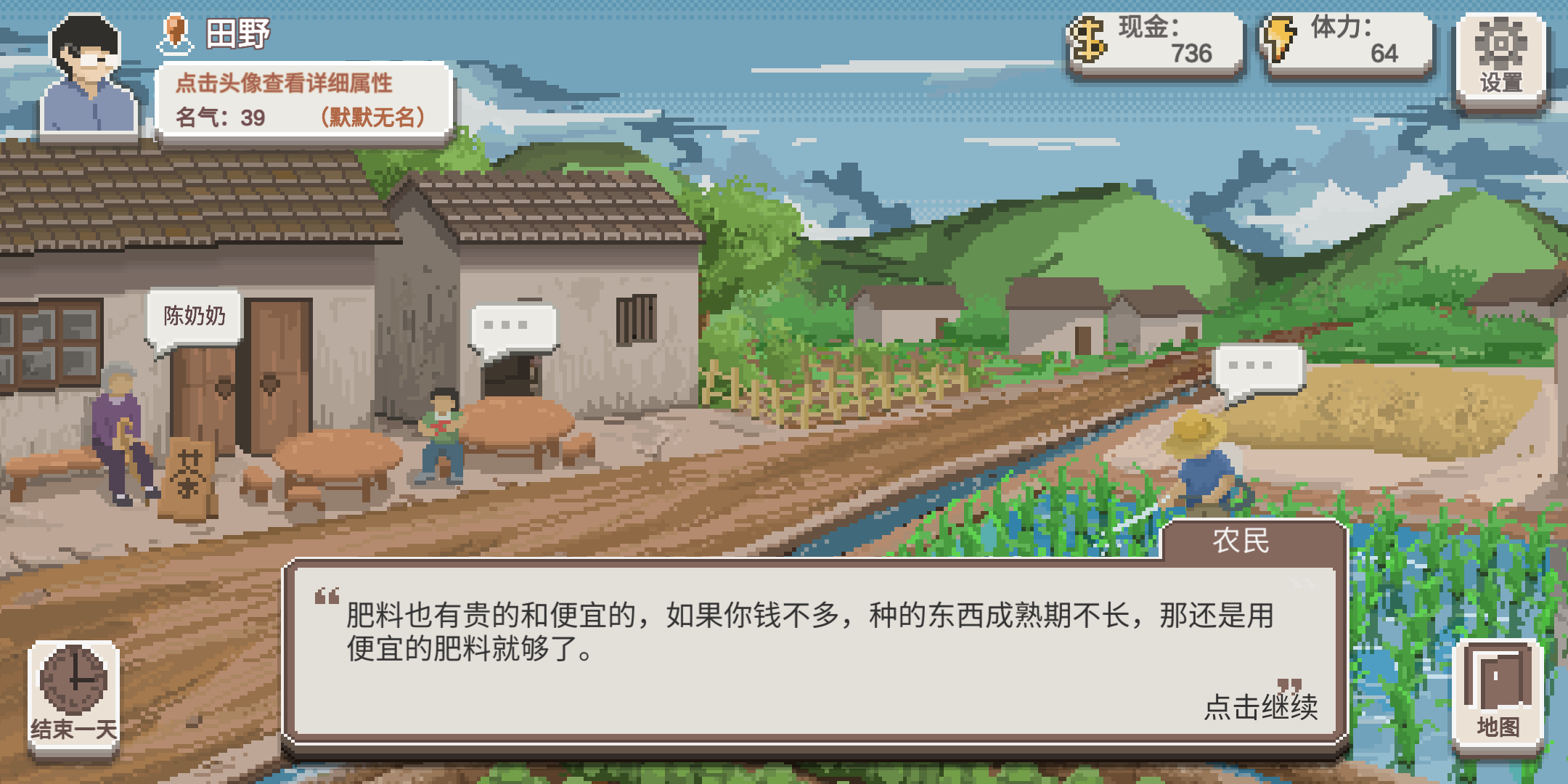 拿赚到的钱去买新田,买种子,然后不断重复即可。二级才可以使用肥料,肥料可以在集市→老八杂货店购买,分别是史丹利200¥/20个和金坷垃400¥/20个,肥料只能是在种子刚播种下的阶段才可以使用,并且每一个蔬菜位只可以使用一次,加速蔬菜生长速度。