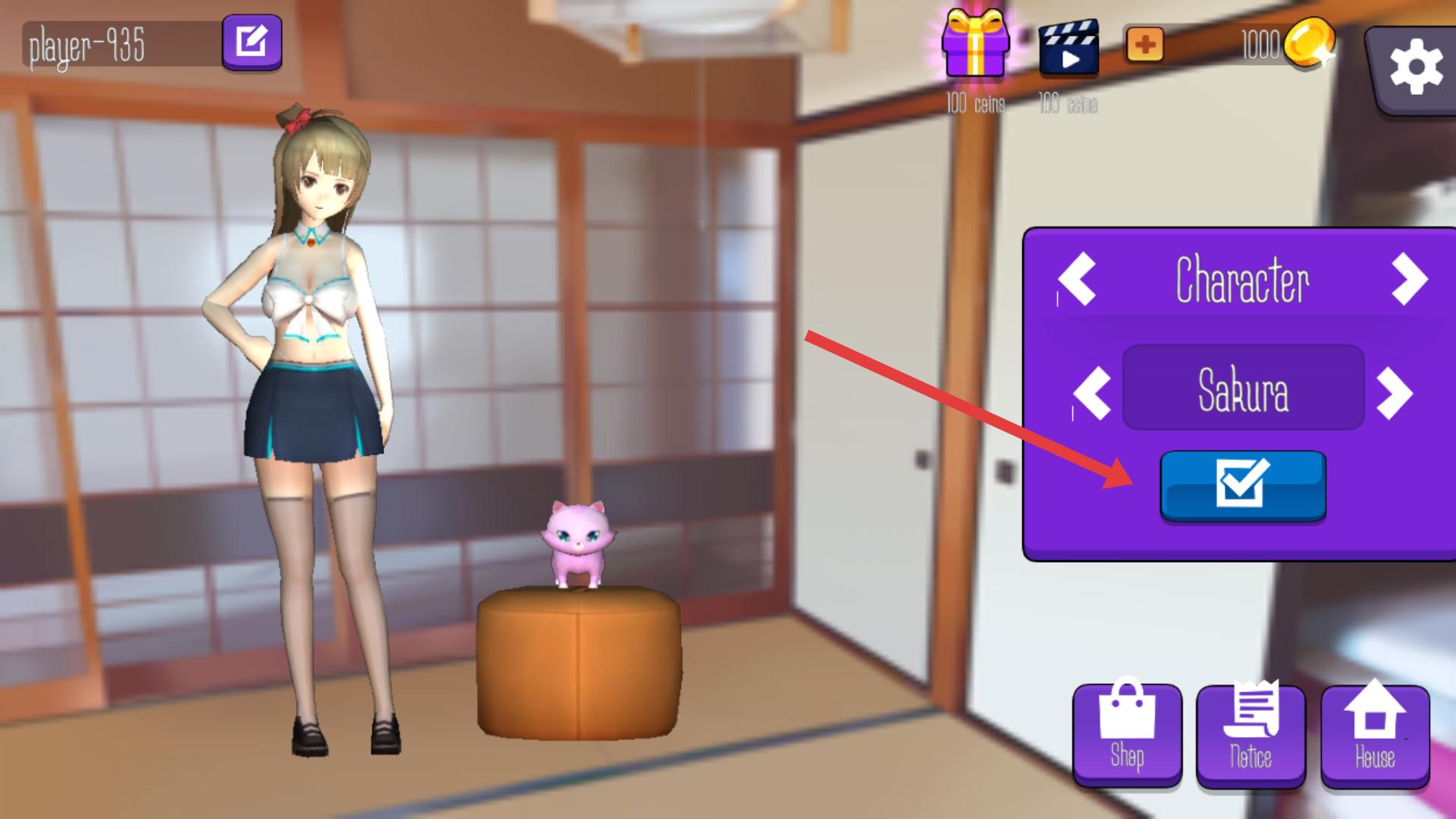 2、在角色选择界面,选定Sakura后点击确认,进入房间场景,与角色和宠物互动,探索初始玩法。