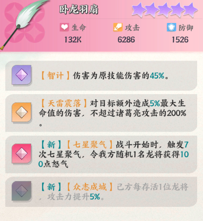 开战时,诸葛亮借来风力相助,对敌方全体施加灼烧,持续10秒四技能:洛水之拥