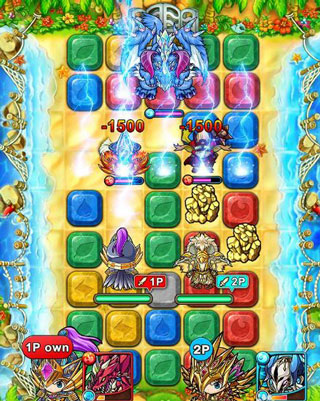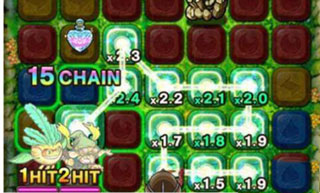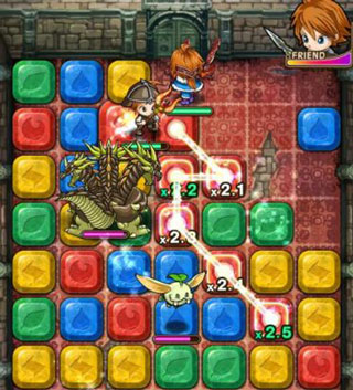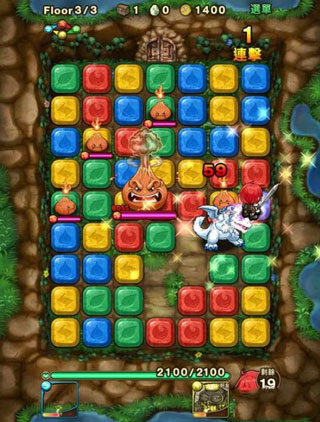 4、战斗系统,在玩家角色週边将同颜色的方块连上,角色就会跟随其路径而行,途中经过怪物就会向他们攻击一次。