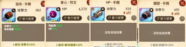 套装组合一般为4+2,套装选择上一般只有攻防套、血防套、攻暴套,输出角色以攻防攻暴套为主,其他角色都是以血防套为主,血防提供的战斗力最高,对于新手来说,前期可以不急于做S3装备,可以先做R级装备过渡,同时慢慢养成SSR装备,为什么这么说呢,因为装备除了升级外,还有觉醒可以开启装备的词条属性。