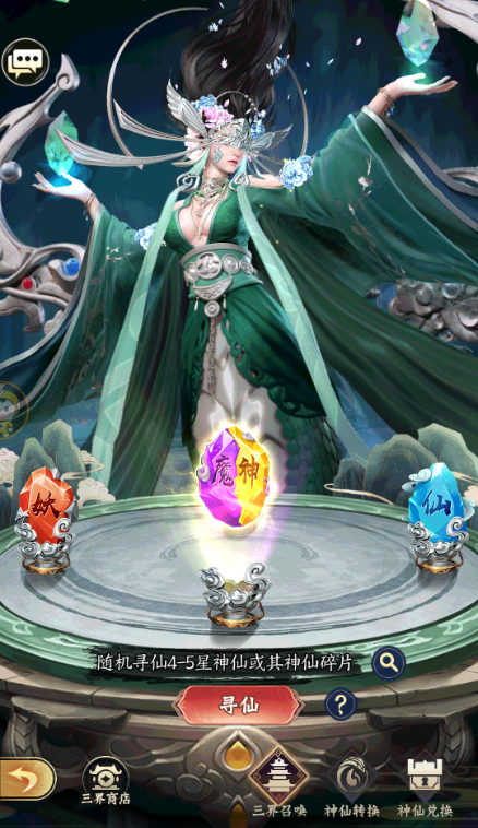 三界召唤可以消耗三界召唤令召唤指定种族的神仙,同时还能通过神仙转换和神仙兑换,获得想要的神仙。