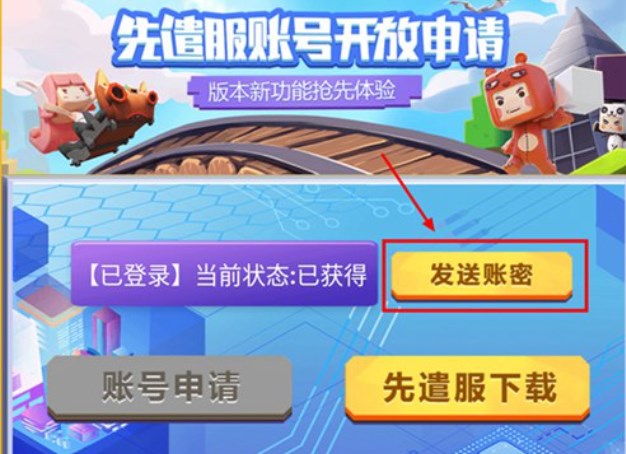 申请成功的玩家按钮将会提醒“已获得”,点击“发送账密”即可将先遣服账号密码发送到正式服游戏内邮箱。
