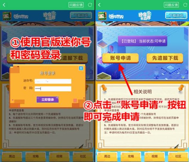 点击下方按钮前往先遣服申请地址,在页面上登录官版迷你号后,点击“账号申请”即可,申请时间为每月11日至当月最后一日。