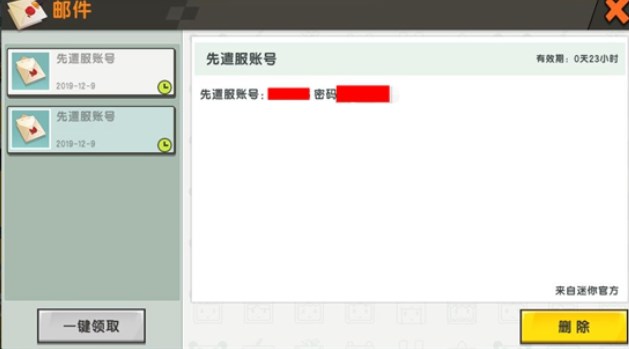 发送帐密后,我们登录正式服,就可以在游戏邮箱里查看先遣服的账号和密码。
