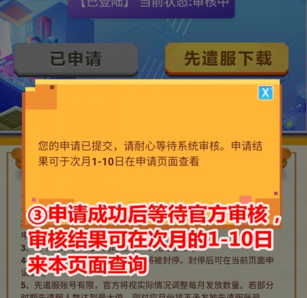 5、先遣服账号有限,官方将视实际情况调整每月发放数量。若部分时期先遣服人数达到最大值,对应月份将不予发放先遣服账号
