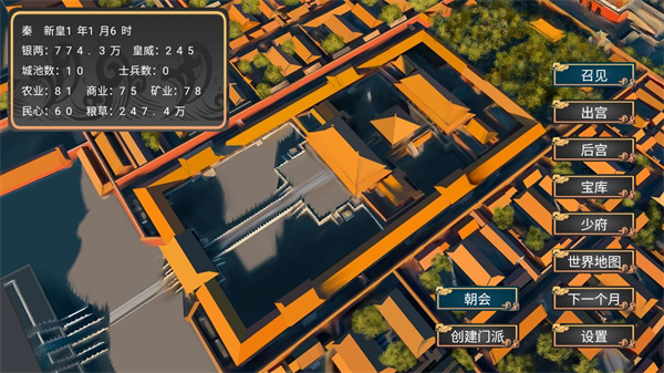 创建门派:如果你是皇帝身份,是无法创建门派,需要退位之后才能建立门派。而建立门派之后,也是可以进行朝会的,然后通过积攒门派威望,进行起义,建立新国家。