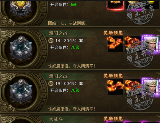 7.新增濮阳之战四层地图 15转且开服90天开放,掉落军师觉醒材料;配套军师觉醒系统开启,入口为 角色-军师-左上角觉按钮